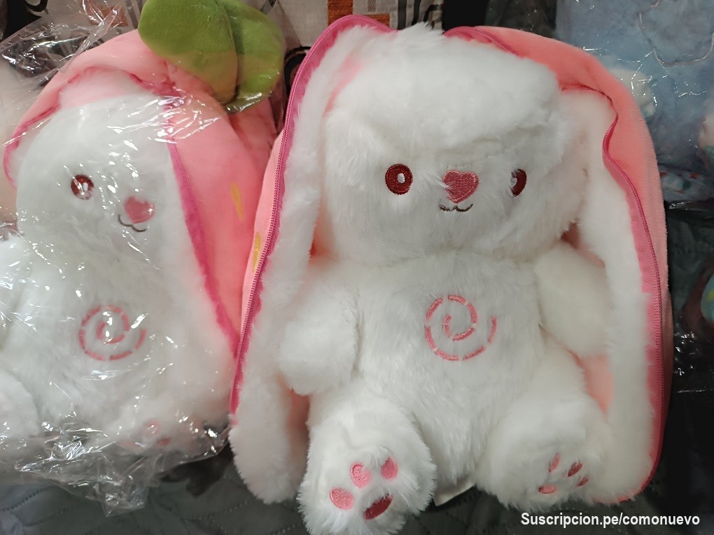 este peluche tiene presentación en forma de zanahoria ,cuenta con cierre y al momento de abrirlo se convierte en un lindo conejito con unas super orejas .
