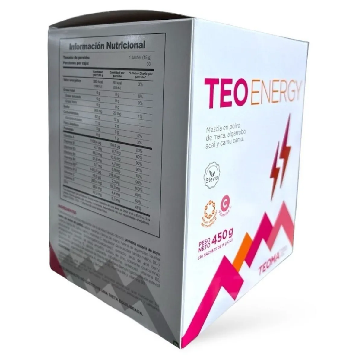 TEO ENERGY, en Doypack que consta de 30 sobres y que puedes llevarlo a cualquier parte contigo, así tendrás energía instantánea para que realices todas tus actividades con una fuerza renovadora. Además de vitalidad y energía en tu organismo, mientras te permite preservar la salud. Este producto está diseñado para alimentar las neuronas y mejorar la conducción nerviosa.